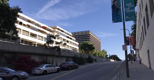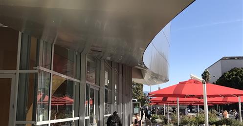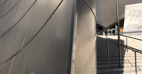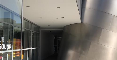 The first view of Walt Disney Concert Hall most people see is the curving stainless steel skin of the building’s exterior. Resembling silver sails, the curves echo the billows in the auditorium and play off the bowed cornice of the Dorothy Chandler Pavilion, forging a link between new and old.