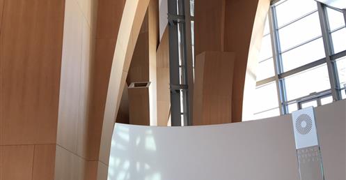 Inside the warm, Douglas fir-lined interior are 2,265 seats that are steeply raked and surround the stage. Ernest Fleischmann, former Executive Director of the LA Phil, felt that balconies and boxes reinforced a social hierarchy and proscenium arches separated players from listeners, and he urged that they be eliminated. In Walt Disney Concert Hall, the orchestra plays in the space in which the audience sits. The vineyard style seating brings the audience close to the orchestra, and offers an intimate view of the musicians and conductor from any seat.