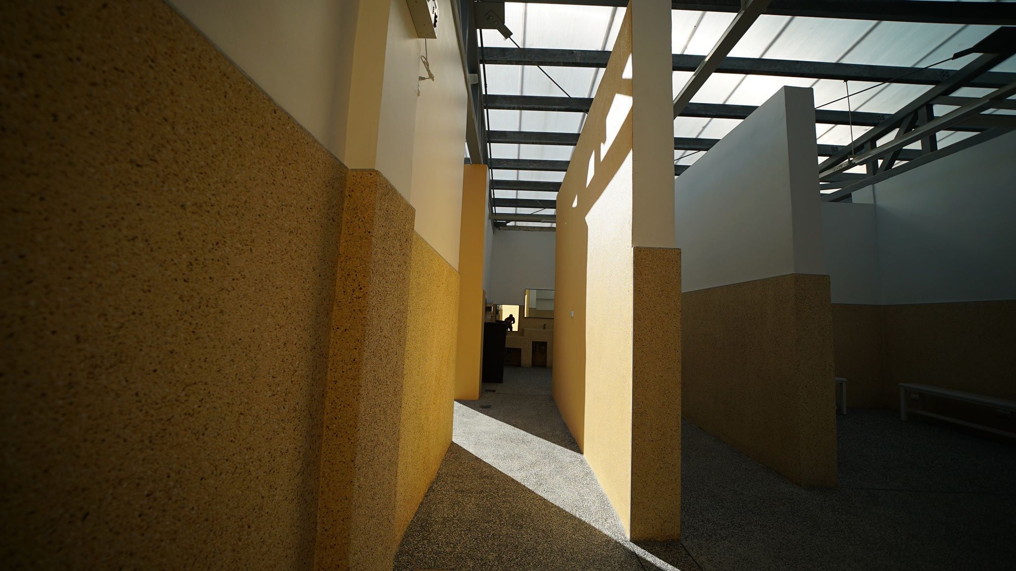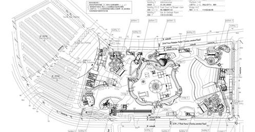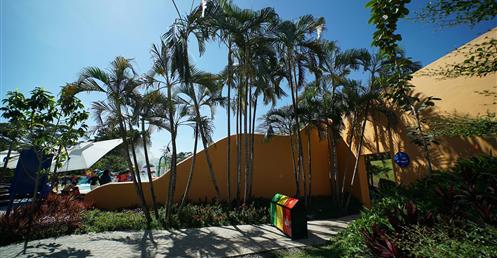 入口廣場以兩道弧形造型牆界定園內園外,長達125m的高弧牆有多處開口,供遊客、車輛行,長30m的低弧牆則強調出購票亭的位置,兒童戲水池則是由另一道弧型牆所界定,此弧牆埋入坡地中成為擋土牆,在這三道弧型牆之間散佈著員工辦公室、男女更衣室、紀念品店、服務中心、置物區及飲食店。
