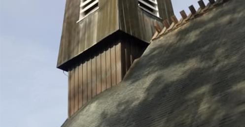 It features a triangle-shaped steep pitch roof, big steeple and as-cast concrete.