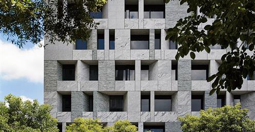 淬取東方文化的本質,以抽象轉化的手法,將文化的氛圍書寫於飄浮之石中。化生墨與竹簡的形象,以動態流動的空間,將文化的面象體現於城市建築中。