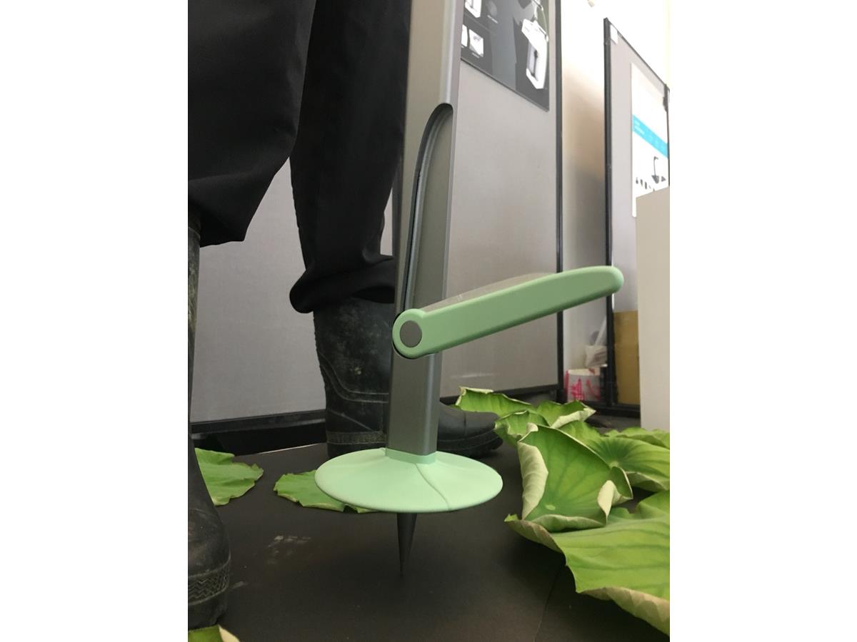 Lotus is the main economic crop in Baihe, Taiwan. Due to the country’s aging population and rural-urban migration, a shortage of workers has severely impacted the lotus industry. Since elderly farmers need to retrieve the lotus from the mud, they may trip and fall from losing their balance. Moreover, they need to use two hands to separate the stem from the lotus and have to hold the seedpod at the same time. Therefore, they may frequently drop the sickle. For this reason, the design adds a walking-aid to the toolbox for lotus pickup and simplifies the process of removing the lotus at the same time. There are two parts in the design. First, the design places the cutter at the bottom of crutch, and thus users can maintain their balance to cut the lotus stem by hooking it up. Second, the traditional Taiwanese texture is used for “Gagia”, meaning the bag, and the blade is added at the front, thereby allowing the user to cut the stem down with one hand and let the seedpod drop into the bag. The side of the bag is designed well to nestle the body, and thus the farmer can work easier in the field.