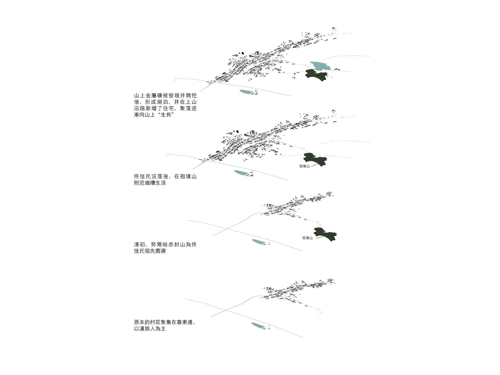 設計將城市機能空間分成生理死亡空間、身份死亡空間和記憶死亡空間。讓走進墓地的人體驗到人類,城市與村莊的死亡。設計過程中,了解到“佟氏文化研究所”這一機構。機能空間使用者設定為研究所工作人員、村民和城市外的佟佳氏後代。生理死亡空間服務于來祭拜的後代的生理需求空間;身份死亡空間機能為農民的圖書館、研究所辦公室、農產品商店;記憶死亡空間包括新祭祖空間、滿語教室、新紀念空間、守陵人墓、一世祖墓。