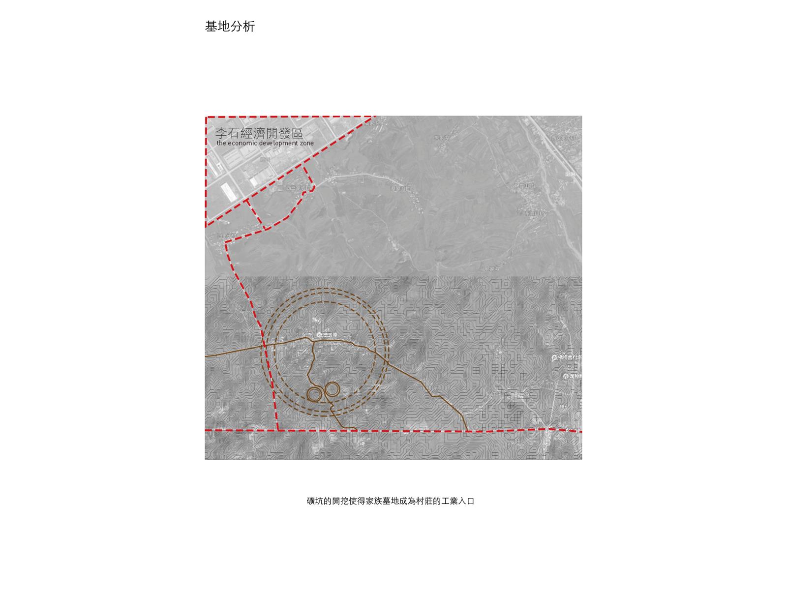 設計在家族墓地這個活的墓裡置入城市機能服務空間,形成一個新的界面,界定墓地與未來城市,進而保護村莊。