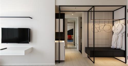 全白意象貫穿客房,藏有燈光的黑色鐵件線條巧妙地將「中」這個文字描繪出來,方正溫暖的格局與大片景觀窗,讓旅人充分欣賞城市天光與美麗景觀