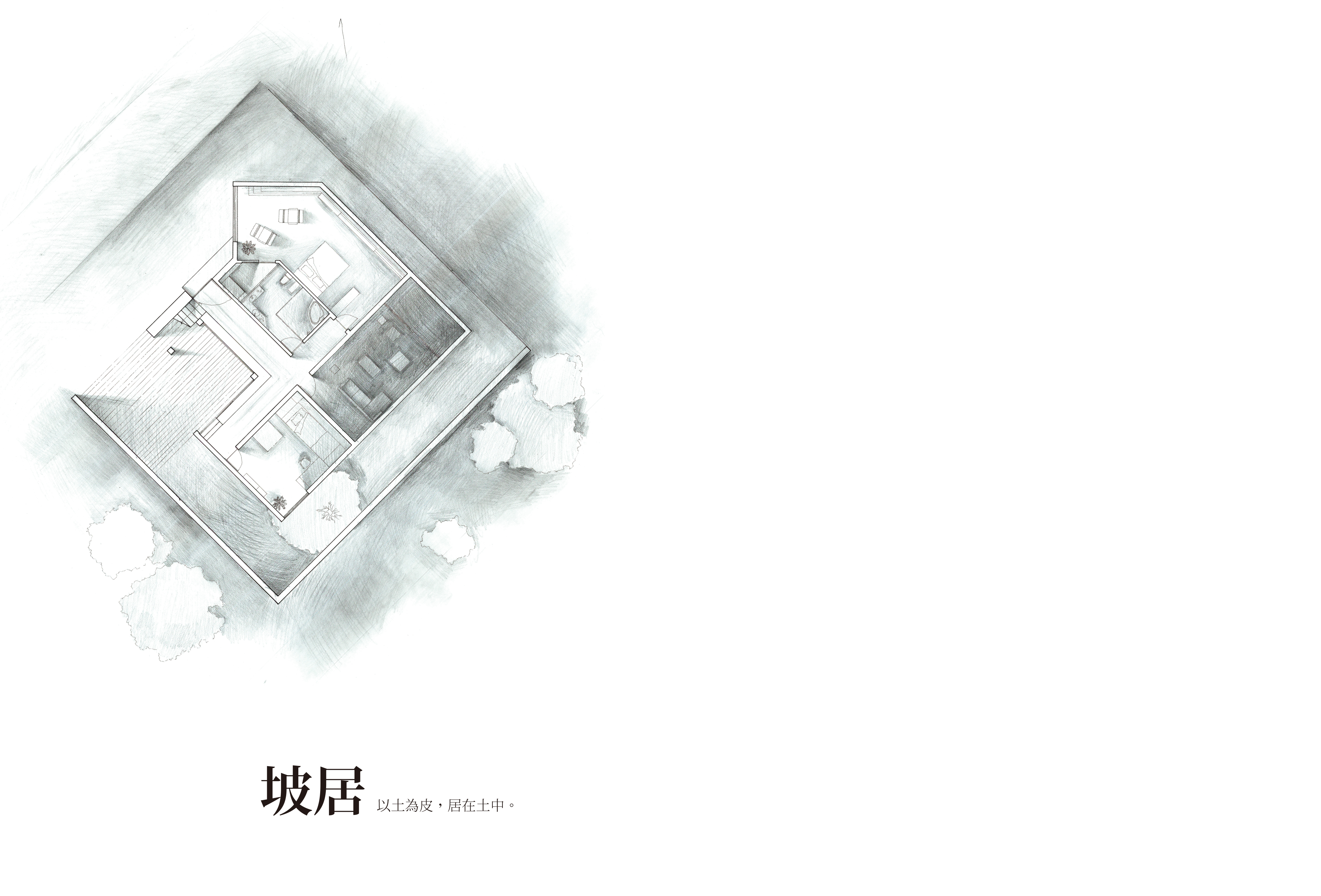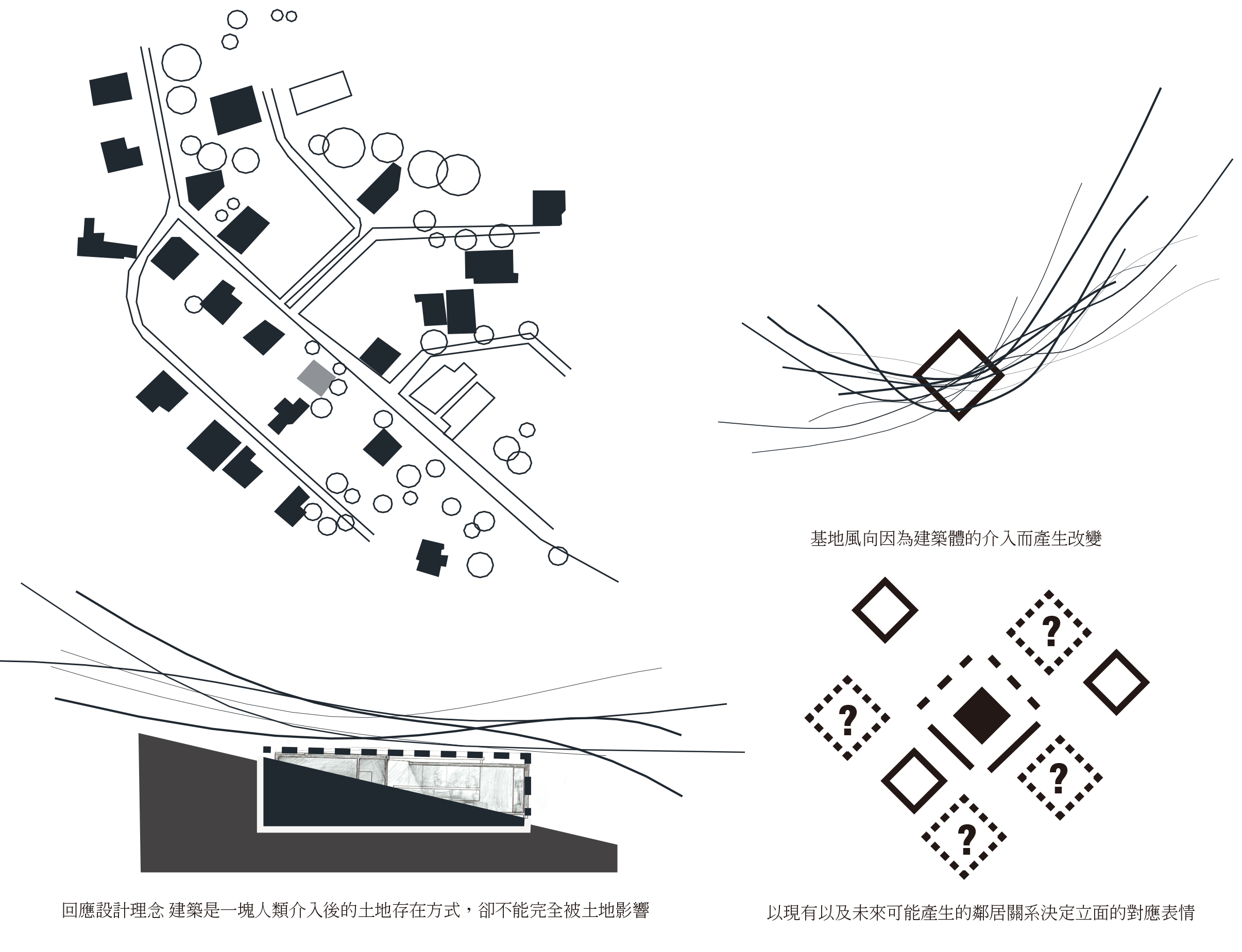 這塊基地,是一塊位於新竹寶山的山坡地,冬季來臨時從山坡上傾瀉而下的是潮濕且刺骨的九降風,在這樣的地形上建築的存在姿態變得很重要,用強硬的態度回應大自然絕對不是個長久之計,我透過壓低建築的迎風面,利用結合坡型的建築將風帶到建築物上方,解決了九降風帶給使用者的困擾,然而環境產生的特性不一定只有問題,我開始思考如何能進一步的利用,透過牆面安排讓風引入建築對使用者達到不同的機能,帶走廚房的油煙,讓曬衣空間通風等。這是一塊山坡地,而在台灣的山坡地會產生一個很大的問題,潮濕 ,同時必須將建築物置入於土地中而又必須產生對潮濕問題的回應,所以我將建築物與土地間的介面做了一個縫隙,這個縫隙不僅是對機能上解決潮濕問題的回應,同時也回到了我最初的想法,「建築在土地上存在的姿態」;因為有「人」所以建築不能完全被土地所影響,建築是土地的存在方式但它不是土地本身,於是設計了整個建築脫開的介面去面對土地。