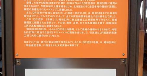 展示的DF50型柴油機車是珍貴的「1號車」,此車輛被指定為「準鐵道紀念物」。