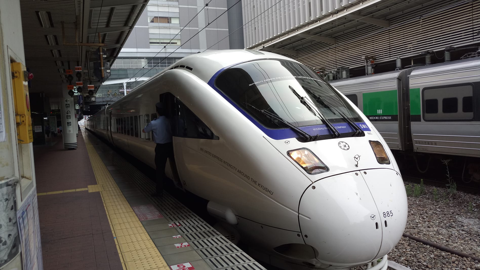 連接博多和長崎的時尚列車,初登場時, 以優雅新穎的流線型成為熱議話題, 885系列的白色車身令人印象深刻。車廂內的坐席非常寬敞舒適。從車窗欣賞窗外佐賀平原和有明海的悠閒田園風光,列車向目的地飛馳而去。