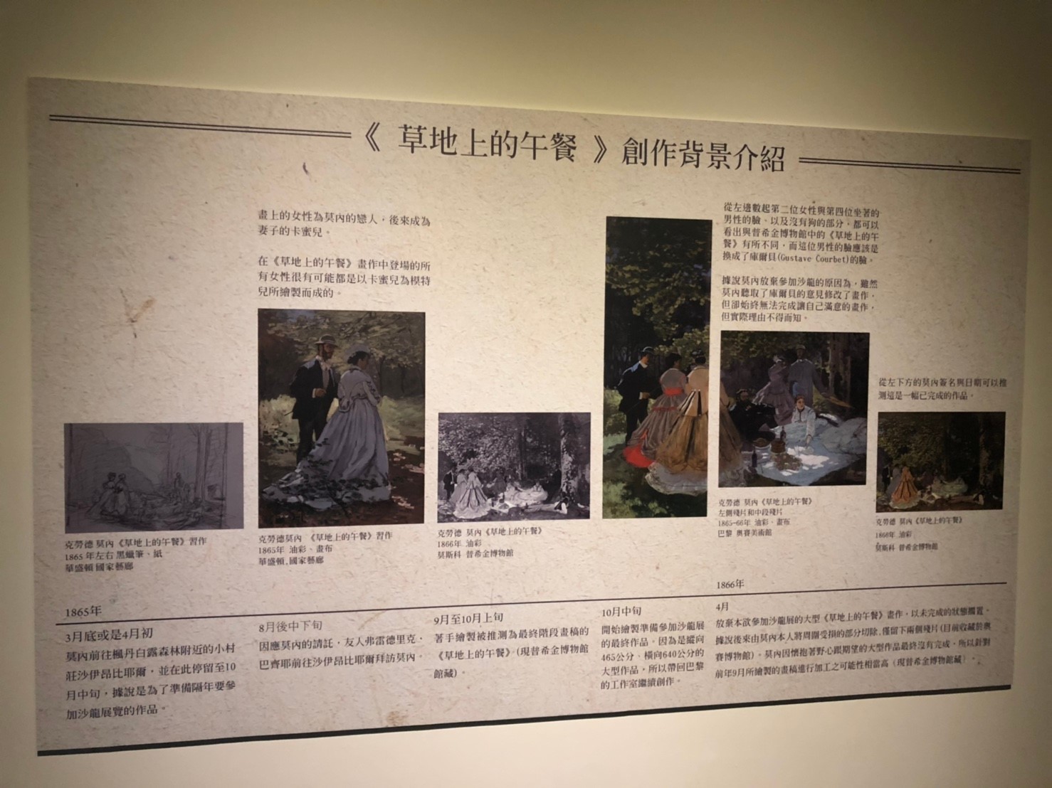 展覽以「近代風景繪畫的起源」、「讚頌大自然」、「巴黎城市光影」、「巴黎近郊的自然景致」、「南法明媚風光」及「海外的異想世界」為主題,引領民眾認識法國近代風景繪畫。其中,首次來台灣的莫內《草地上的午餐》是展覽最大亮點。
