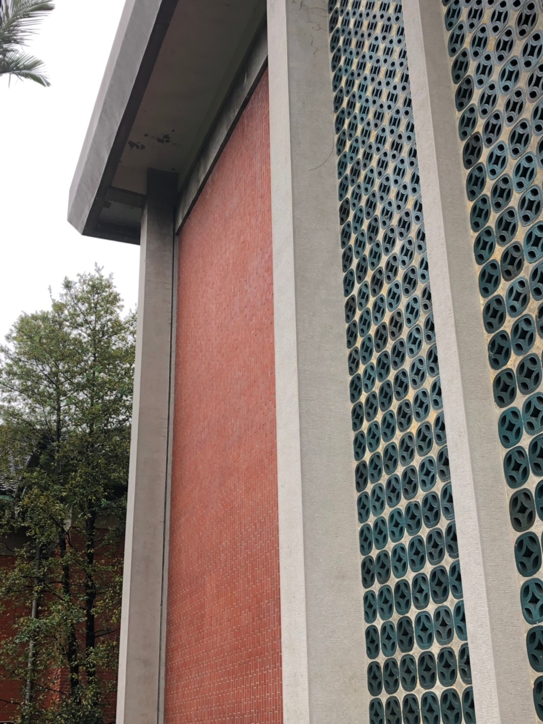 位於台北市徐州路的台大法學院,原擁有日據時代所建之木造圖書館一座,1960年代以來學生人數急速增加,舊館已不敷應用,乃籌建此館。這棟建築採古典建築三段式做法,有台基、屋身與屋頂,但方式是間接與隱喻的。在屋身正面部份,除外露原有的結構柱以外,花隔磚的部份還加了六根非承重、每個柱間距兩根,切成三等份。因此在五開間的立面上,又疊上了九開間的花隔磚立面。再者就是入口左右的扶手,在細部的處理上也是難得的佳作,譬如說扶手面走到建築物前兩公分左右處嘎然而止,或者扶手立柱在與扶手面接觸前的收縮,都讓簡單的扶手增加了許多空間感。