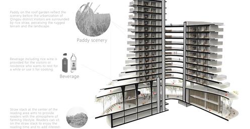 米食文化是台灣傳統農業文化中最重要的部分,回應我們在設計發想上的初心—「桃園在地農家傳統」,我們將「稻米」與「稻稈」廣泛地運用在建築材料與室內設計上,透過稻稈製成家具、書架、帷幕等,並創造以水稻田意象為主題的空中廣場,讓群眾能最直接地接觸、認識這樣美好的農業文化。