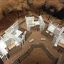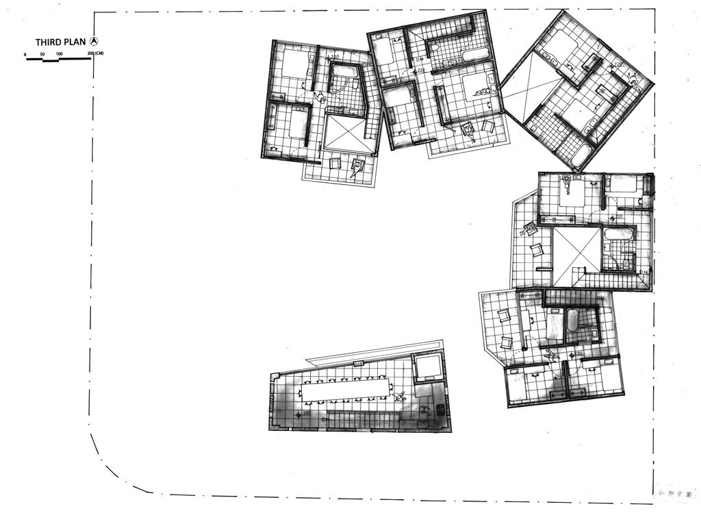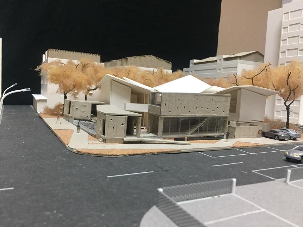 外圍的量體一部分是作為外到內的通道,我刻意讓這個通道有點曲折,光線明暗交錯,呼應故事中通往桃花源的不易,另一側的量體是社區的共享食堂,社區可以在一個禮拜中固定某個晚上一起吃頓晚飯,交流情感,位於二樓的食堂邊吃飯時可以俯瞰整個社區的庭園,是一個舒適的空間,量體的一樓是一個對外的小市場,販售社區庭院種出來的蔬菜水果。