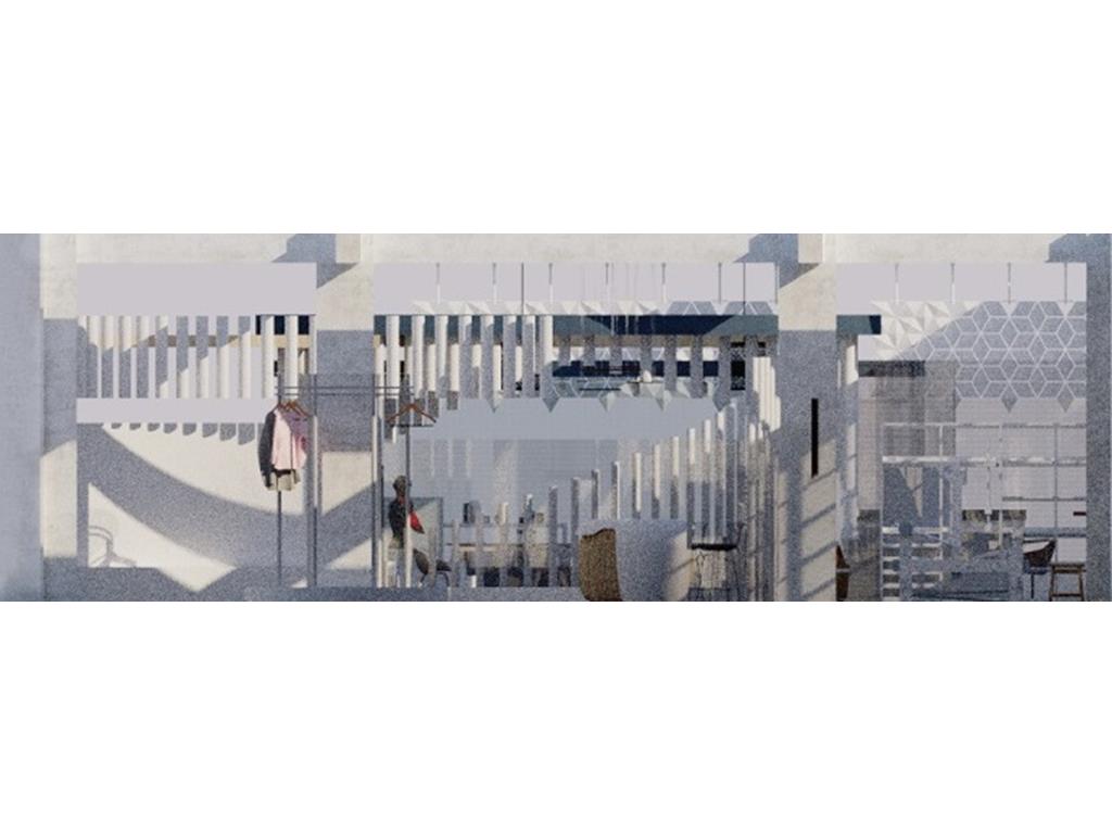 通過共同的愛好,將一個個的人(一個個的量體)彙聚到我們的基地,生活開始有連結,相識,對於空間來說,人是單個小量體,而對於更大的外面來說,也許工坊也是一個聚集的小點,正如天邊的星辰,一個小的量體,在不同的量體的比較之下會呈現出不一樣的狀況,列如與小的比則大,與大的相較則小。在空間上我們也採用編織牆面的手法去凸顯編織這一個特點在平面上,我們呈現的是一種串聯包裹的2D形式,在立面上,我們利用單個量體的長短你排列去圍塑空間的層次感,使他在不同的視角上能夠有獨特的交錯包裹。以大圈的大面積為自造者主要區域,根據人員類型規劃動線,利用T台高度,將它的功能變得不止於走秀,而是可以當作椅子進行利用。