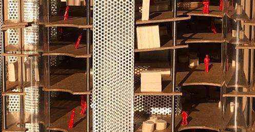 以實體虛體與樓板交疊操作,使得空間產生滲透性,實體與虛體交互產生使得人的活動產生互融 ,實體作為直接性的互動,虛體則柔化交融形式,空間的滲透性在此產生;樓板的交疊,使得人在空間的活動並不是純粹的垂直水平性移動,以三維曲度樓板型式作為空間分界,而非以牆做為區隔,空間的內外分界變得曖昧且多樣,人與人之間的互動產生多樣維度的交疊。