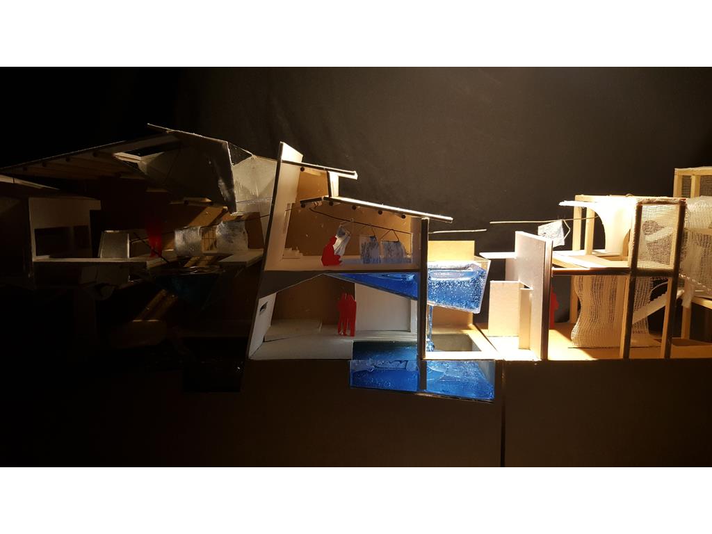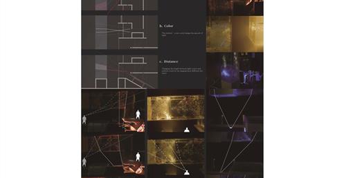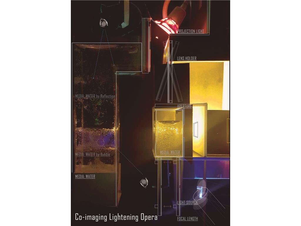 我做了一系列的光學實驗,發現反射的角度及次數會改變成像的大小,介質的狀態會改變成像的紋理、顏色及位置,並製成三種不一樣改變成像的裝置,實驗一場光+水+成像的空間劇場。發現空間中的訊息會藉由直接+間接+扭曲的方式傳遞到人的眼中,讓不同的空間之間產生一種特殊的空間關係。