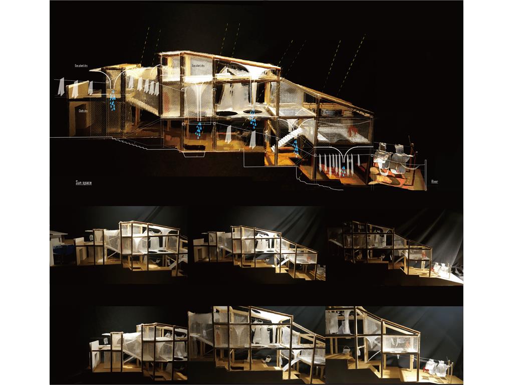 藉由自然光經過不同的水進入下方的藝廊空間讓人們藉由光與成像的方式來體驗藍染的作業空間與動作。
