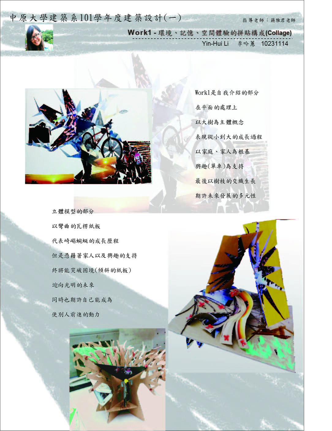 work1 自介 平面處理以大樹為基礎概念,表現從小到大成長過程,以家庭、家人為根基,興趣為支持,最後以樹脂的交織生長,期許未來發展的多元性。 模型部分,以彎曲的瓦楞紙版,代表一區蜿蜒的成長歷程,但是憑藉家人以及興趣支持終將突破困境(傾斜紙板),也期許自己能成為別人的動力。