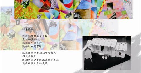 work3 資訊站 印象地圖,以色彩豐富表現農村作物多樣性,從圖面左邊連結到右邊市區,進而彼此交流。 生活模型,以傳統三合院為基地,表現農家獨有的生活,觀察對象為原住在合院的農民、外地遊客,與基地的互動有無,藉由了解基地特質,進而推廣農村。 基地模與資訊站,基地選在蔣公行館後門,藉著一片農村好景勾起人們對農村的意向,使市區與農村產生連結,整體以竹子為架構,圓環有包容保護之意,象徵農村的溫暖,陽光從竹子縫隙撒下,搭配著微風,亦有讓人置身農村之錯覺。