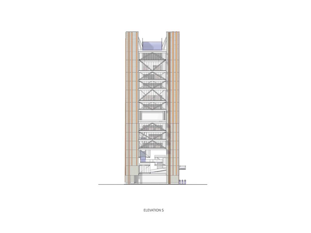 從辦公室的角度來看,我將綠色運輸與工作、旅遊、運動、產學合作、運動等等面向結合考量,提供對應的PROGRAM,希望可以與周邊環境達到最大的綠色運輸效益。一樓戶外及頂樓提供極限運動場,同時自行車可以從一樓的自行車道沿著建築量體向上騎,五樓設有最新的自行車展示區和腳踏車停放區,同時五到七樓是辦公室,八樓則是騎車流汗了可以來這裡沖澡,設有澡堂和BAR台,樓上則是工廠和其他辦公室。