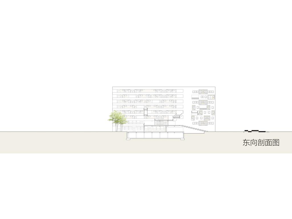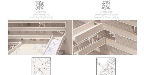 面對年輕族群上下班的日常社交需求,我以不遠處民生社區層級式的街巷組織方式為範本,通過在基地內製造街巷尺度的立體動線,使年輕人的歸家體驗得以于樓群間產生交集。