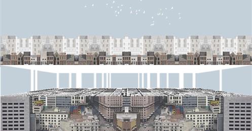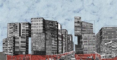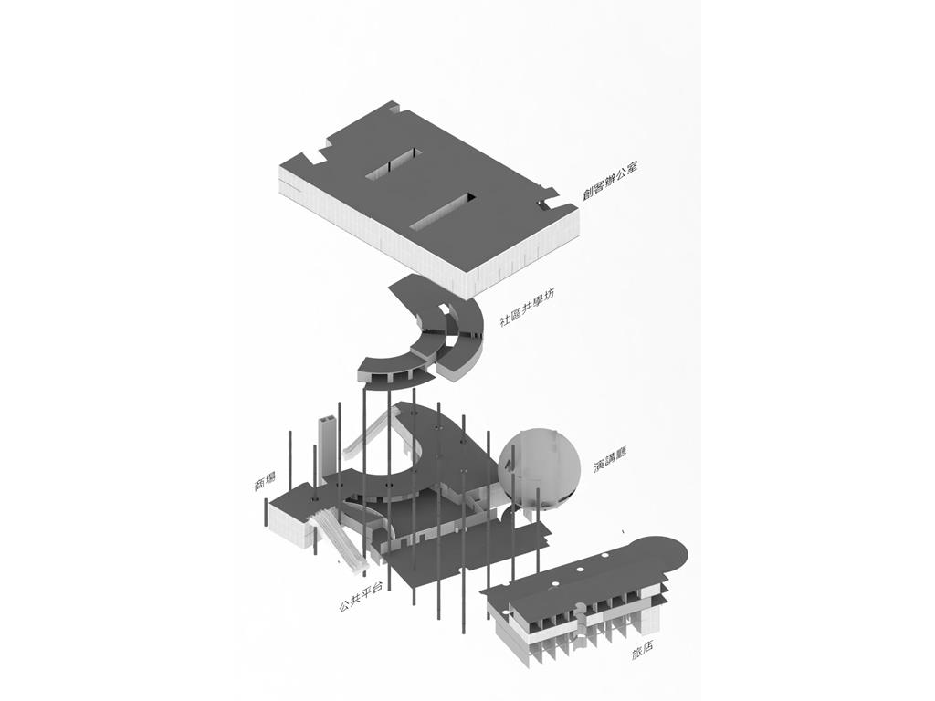 上方創客中心的公共性機能和下方商場和旅店的公共性機能都放置在中間,這個空間即為創客烏托邦面對到都市的中介空間。上下兩部分,用形體和結構系統區分開來,上方用一個純粹的量體來象征新秩序的建立;下方回應中區都市紋理,用破碎分割的量體和基地四周的街道相連,因為對於中區來說,只有在街道上日常生活才是活生生的。