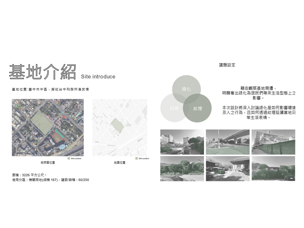 建築基地位於台中市郊,柳川附近,鄰旁多自然美景,擁有豐富的植被和柳川水道。目標是在此建立一個以大自然為基礎的綠植體驗中心,並藉此提醒人們:我們與環境生態的密切聯繫。