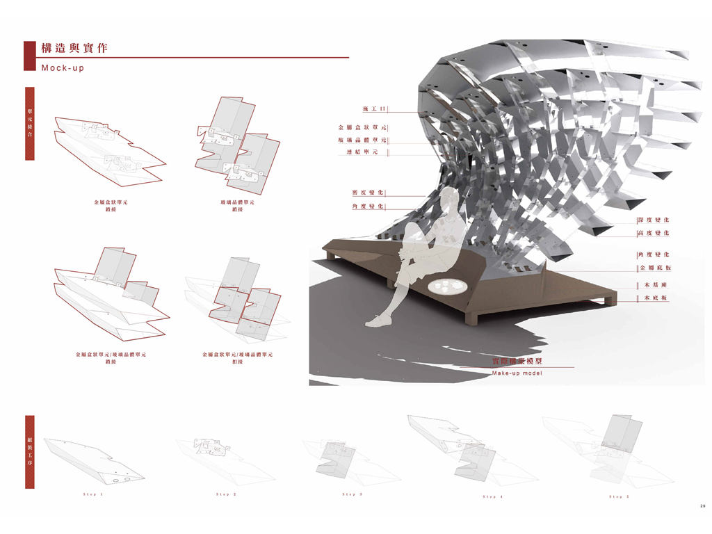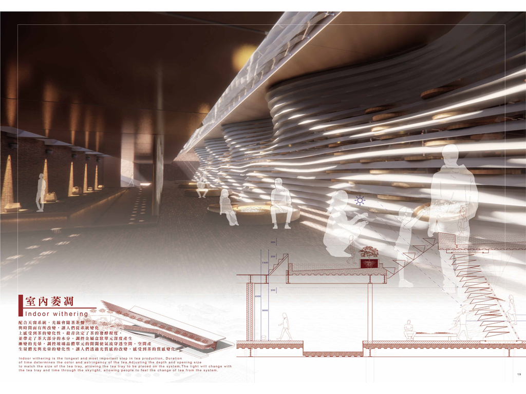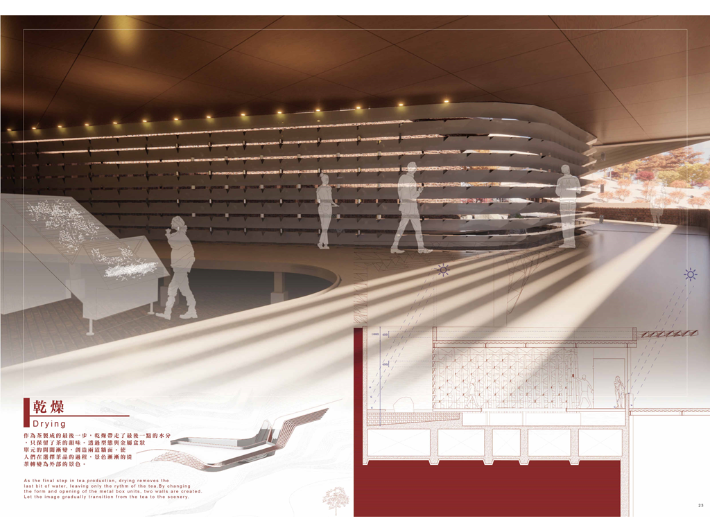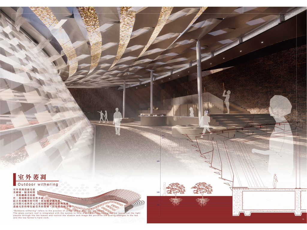 以茶的韻味變化作為空間的精神,研究建築的介面如何調控空間的韻味,並設計”盒狀交織系統”來達到空間韻味的漸變。透過金屬盒狀單元與玻璃晶體單元控制空間的光影、光暈、影像、封閉等空間元素,並以單元的交織組合形成穩定的結構系統。所,代表的一個恰到好處的空間。透過盒狀交織系統控制的韻味變化,為茶製成的7個階段創造7種恰到好處的韻味。