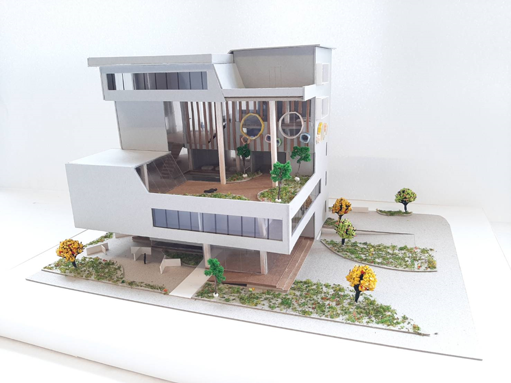 上層的量體透過拖出80公分的水平及垂直,不同大小的窗,來優化室內空間的使用,也讓立面與圓形拖出語彙有所呼應。