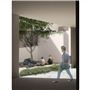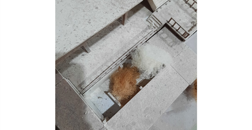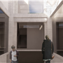 往B1的入口設置在1F中央並透過階梯往下移動,然而室內高度僅有2.5M讓低矮且壓迫的感受湧入參觀者的思緒,同時階梯上面有著挑空兩層的開口讓光能透過時間的流動以不同的光線穿入並帶入B1。