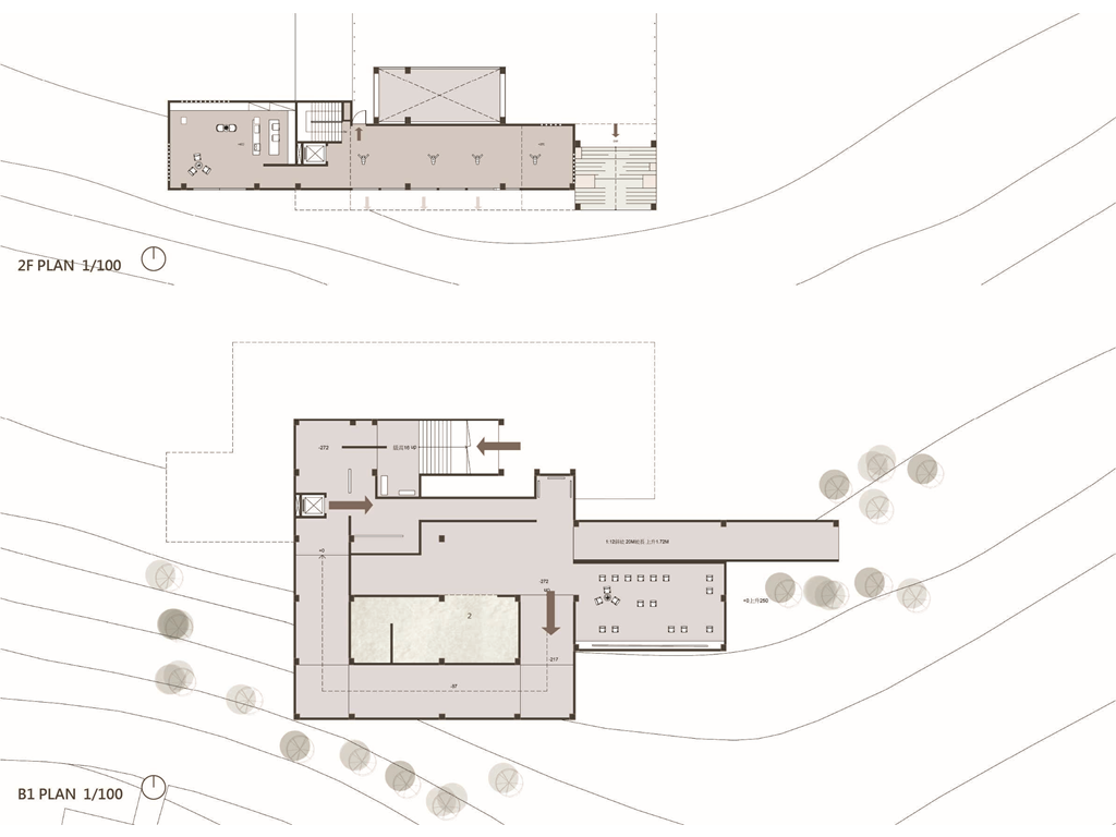B1的參觀迴路中有著多個開口連接到戶外及大型社交性空間,透過迴型動線的坡道將參觀者往上做引導並透過各種開口框景去表達自然,參展動線會一路連接到1F,方便連結到其他空間上。