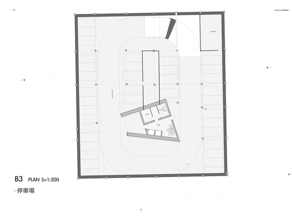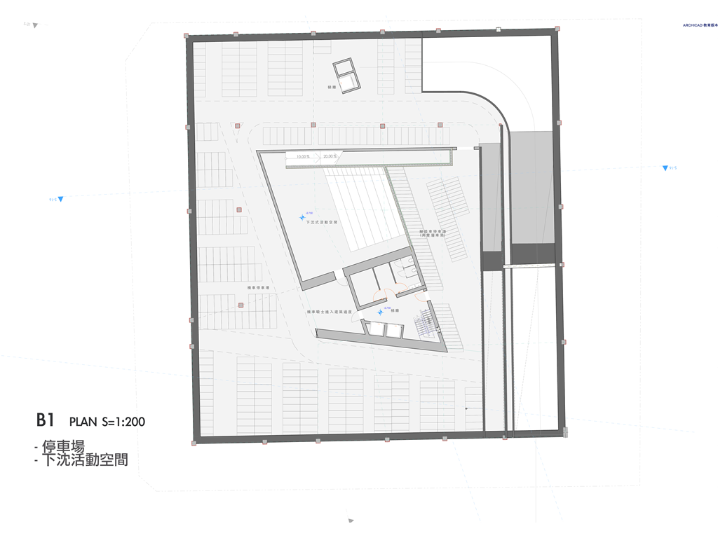 該基地原案以停車空間作為主需求,並設立社福機構,提供相因應內容,本題保留原有停車空間及里民辦公室及社區活動中心外,須加入另一個空間機能。
