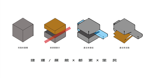 因此,我在這次的設計中加入許多漫遊的誘因在既有動線中,如展示空間與可提供市集空間的半戶外廣場。結合都市更新處的機能,一方面可以定期展示一些城市模型,另一方面是使里民更容易暸解環境更新的進程,而不是總是處於被動的狀態。我也希望藉此捕捉到人們對於自己住所即將新建的建築空間機能的想像。