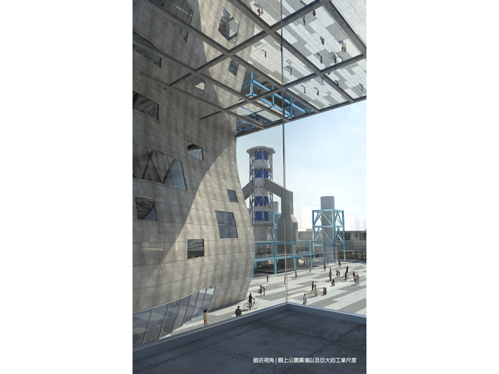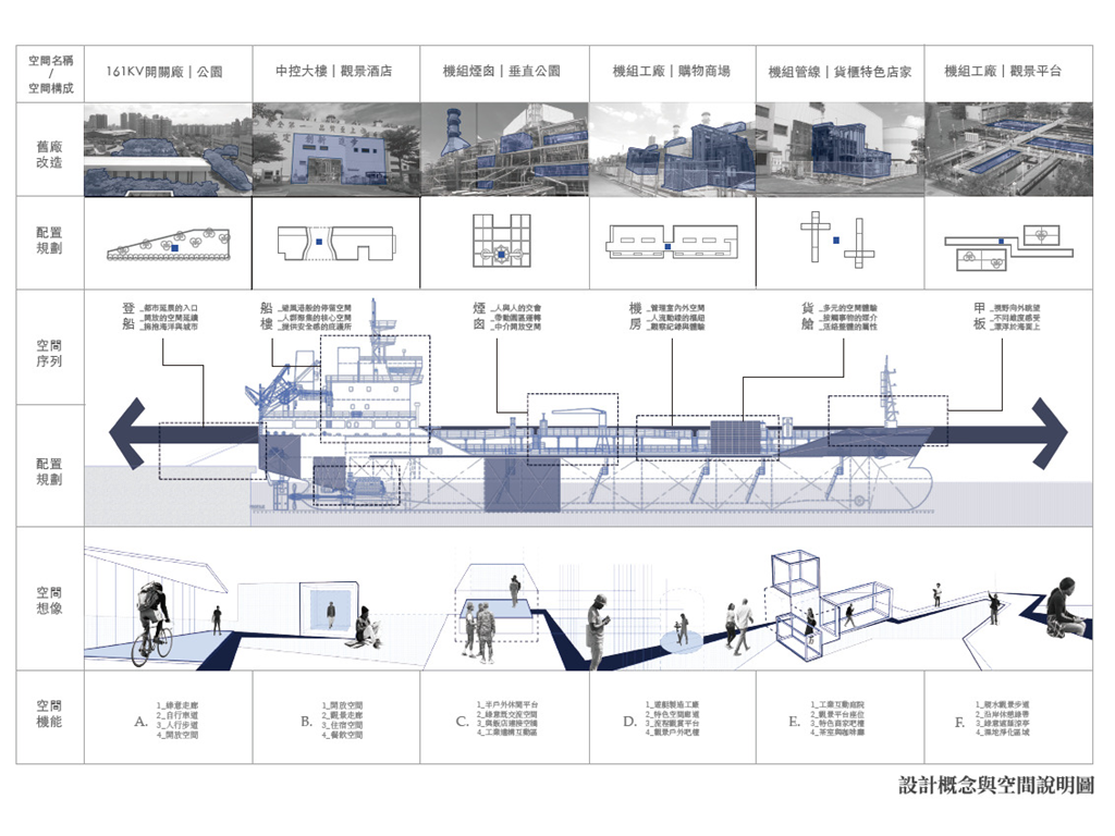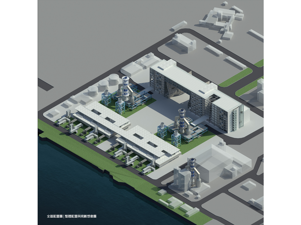 而此設計的基地,即為這沿海帶狀的末端,一座經變更用地準備廢棄的火力發電廠,在此基礎上,本設計將闡述另一種高雄港區開放,與都市記憶接軌的可能性。燃氣為主、因排放大量甲烷造成許多不安的發電廠將廢除,期望透過量體操作的強烈軸向性,將港岸邊奔向海洋以及擁抱城市。