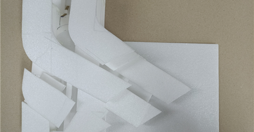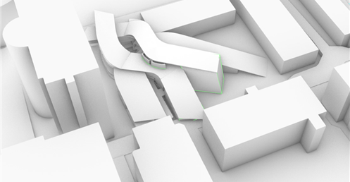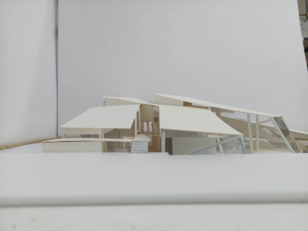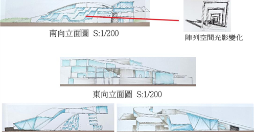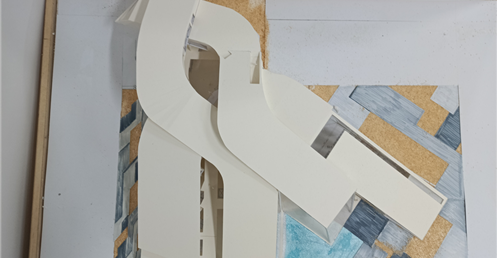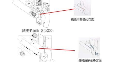 我將分裂的量體運用三條線性整合,一個是U行的線性表達希望人在基地上的環繞或是逗留,再藉由兩條閃電型線性互相攀爬纏繞,表達空間的流動性,在條線性纏繞都過程中,形成了多個虛空間和實空間的事情。