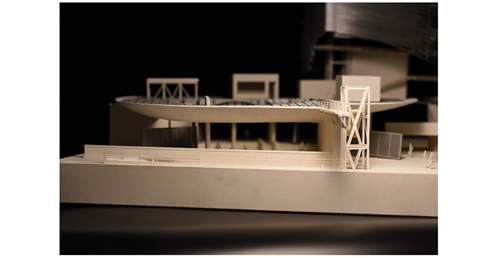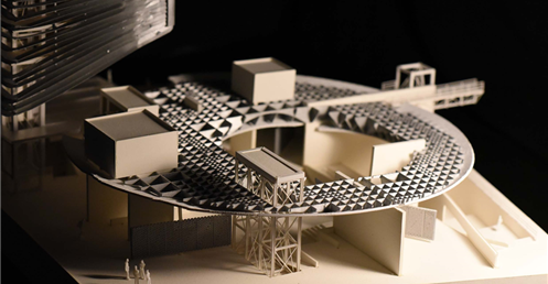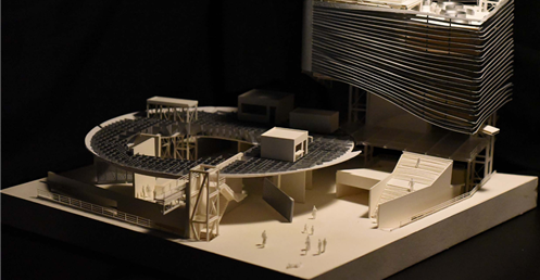 在建築的量體上以巨大的內縮圓盤將人們導入地面的廣場及校園,且圓盤同時串連著校內及校外的小型廣場,並將育成中心及工作室空間收集成方盒至於基地的東北角,藉此拉開與其他建物的間距,量體上降低的圓盤量體,讓光線在立面上的變化也能快速的將資訊反映在大眾的眼球下,借此加強資訊變遷的可閱讀性,讓光不僅是具象的活動關係,而是能被富含著環境變化下的資訊。