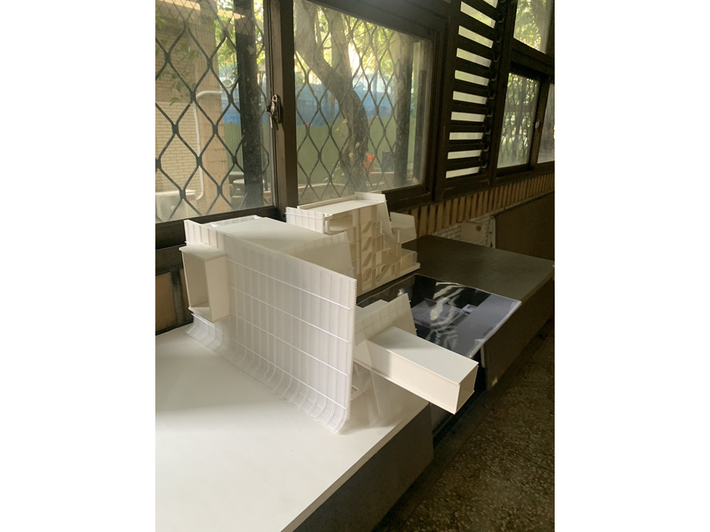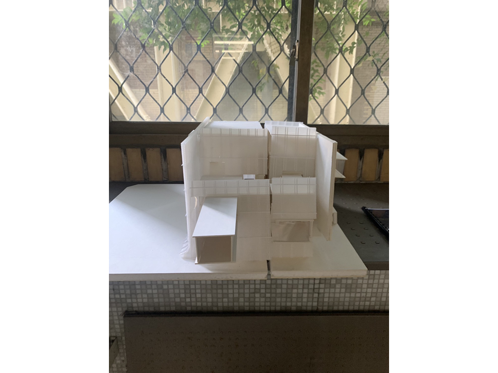 里民服務盒(垂直動線),則是位在左上角,除一樓里民辦公室與垂直動線本身無關因為考慮需連接大馬路方便與外界溝通為由設置,從二樓到五樓分別設置托兒中心、托老中心、桌球場和觀景台、健身房等設施。提供里民基礎的服務以及舒適的運動空間。
