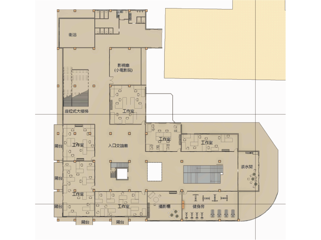 考慮到設計系學生時不時需要靈感的創造,此場地的外型輪廓也因此設有稜角,上下層的平台也有不同的視覺感受。