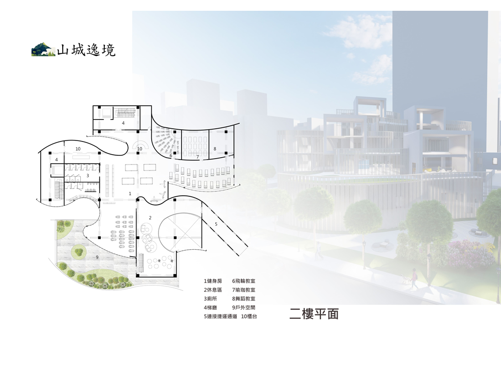 首先整體建築的空間計畫我把他奠定為以交流活動為主的空間,一樓我的量體旋轉了45度側像面對整個城市以前低後高堆疊的方式溫柔的隔絕住宅區與商業區的寧靜與喧嘩,並且創造出一條中軸線完美將原本的公園切割成三個不同性質的小廣場,一個面對城市容納下捷運的人流做為緩衝,一個面對比較寧靜的住宅區圍塑出一個可以自由交流的且具有隱蔽性的小廣場,一個為迎接入口的門面,用三種不同的意境逐漸帶入建築中。一樓動線住要切割為兩個區塊一個為主要通往一樓美食區吸引人流的一個主要入口,其次為一條面對居民的小徑帶入三樓以上的行政社區空間做一個動靜間的切割。二樓主要是健身房,且以休閒空間為媒介連結捷運的通道作為兩者之間的緩衝,三樓以上為行政空間及社區教室服務里民之間的需求