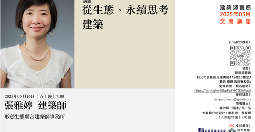 感謝 張雅婷建築師 2025年5月16日(星期五)晚間蒞臨「建築師藝廊」,與我們分享專題「從生態、永續思考建築」。