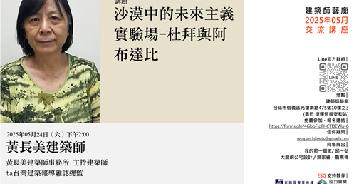 謝謝蔡淑瑩老師的引介,「建築師藝廊」非常榮幸邀請黃長美建築師於2025年5月24日(星期六)下午,與我們分享她近期赴杜拜與阿布達比的建築參訪之旅。
