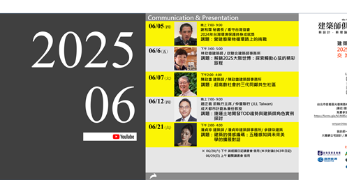 本月活動聚焦永續、城市發展與人本建築思考。內容涵蓋營建廢棄物循環再利用的制度挑戰,從環保政策角度檢視建築產業的責任;並透過大阪世博的觀察,解析大型國際展會如何以建築與策展觸動人心。面對超高齡社會,講座提出三代同鄰共生社區的空間想像,回應居住與照護議題;同時探討捷運 TOD 土地開發趨勢,說明建築師在都市更新與交通整合中的關鍵角色。最後從建築美學與五感經驗出發,延伸至 AI 與情感設計的結合,思考未來建築的人文深度與感性價值。